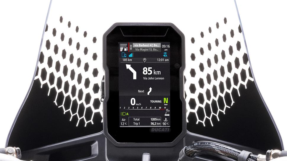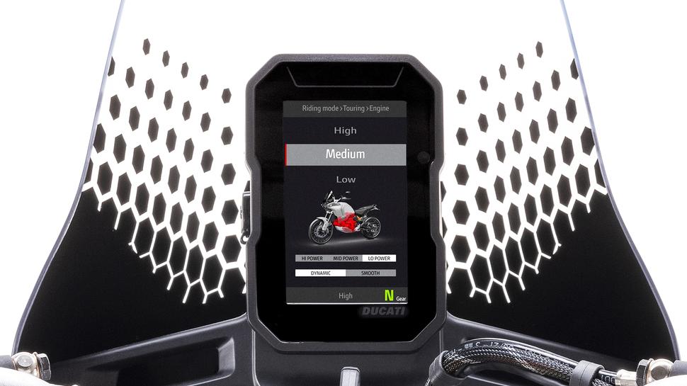 Ещё дисплей участвует в выборе и настройке режимов езды, которых шесть: Спорт, Туризм, Город, Дождь, Эндуро и Ралли. В каждом можно дополнительно отрегулировать ABS (3 ступени), трекшн-контроль (8 ступеней), вилли-контроль (4 ступени), торможение двигателем (3 ступени) и выбрать один из двух вариантов отклика на газ.