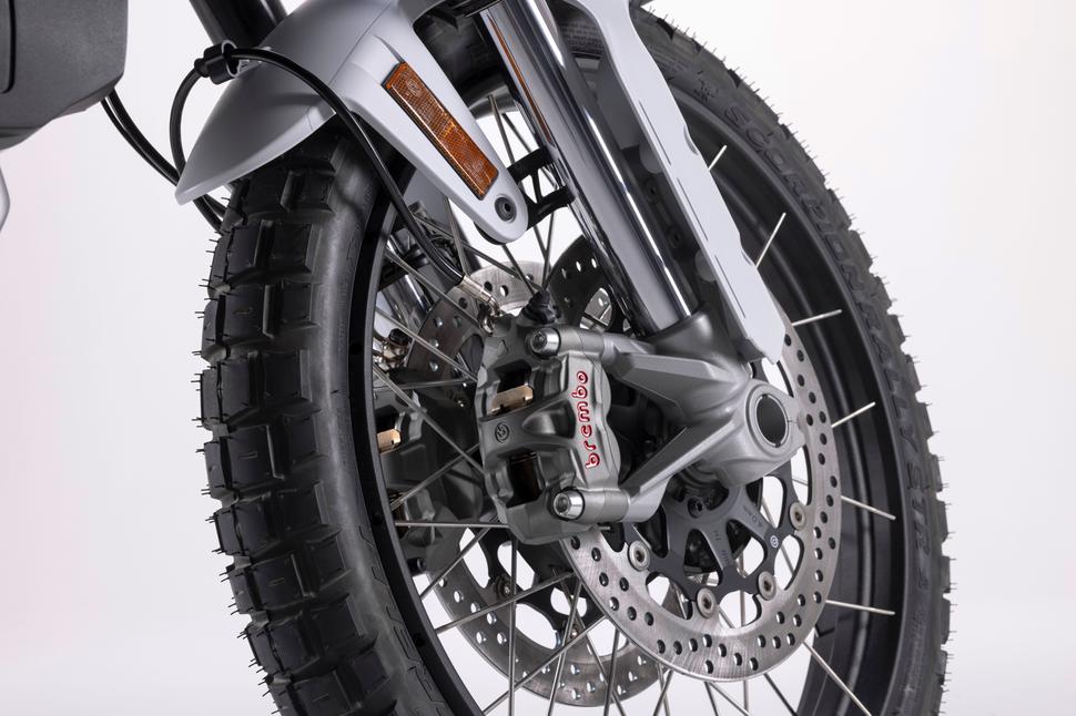 Тормоза на DesertX стоят от Brembo - два моноблочных радиальных четырёхпоршневых суппорта M50 спереди и двухпоршневой плавающий суппорт сзади. Наклонная ABS (а значит, и устройство измерения инерции) идёт в базовой комплектации, при этом отслеживание и учёт угла наклона для работы бортовых ассистентов работает только в четырёх асфальтовых режимах езды. Спицованные колёса рассчитаны на бескамерную резину (камерную, при желании, тоже можно поставить) - типично внедорожное 21-е колесо спереди дополняет 18-е заднее.