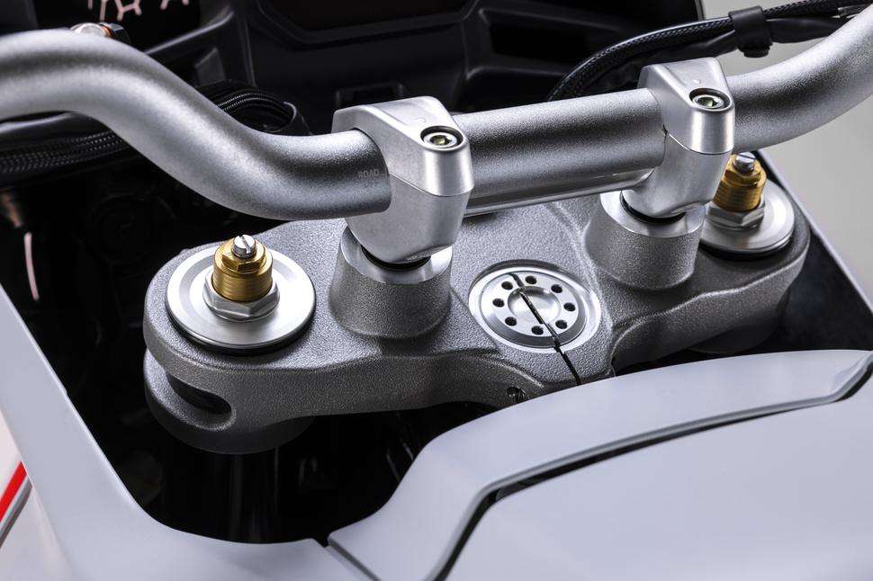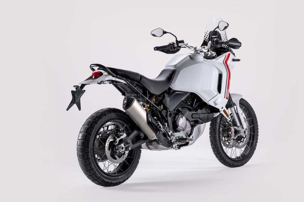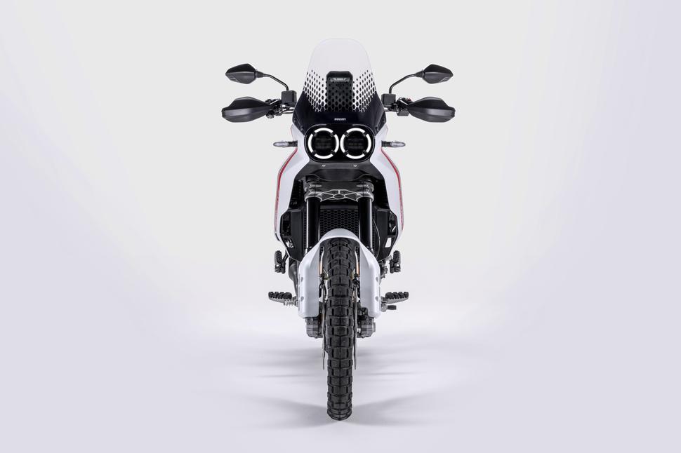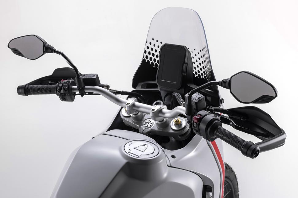 Аэродинамика облицовки продумана так, чтобы выводить жар радиатора через отверстия позади него. Ветровое стекло не регулируется, но по словам Ducati, будет доступно опциональное с улучшенной ветрозащитой. Кстати, об опциях: дополнительный бензобак, судя по всему, закроет возможность установки центрального и боковых кофров из каталога Ducati, так что тем, кто хочет И запас хода, И багажные ёмкости, придётся довольствоваться небольшой мягкой сумкой на пассажирское сиденье (которое, кстати, снимается как раз для расширения вариантов перевозки багажа). Ну или листать каталоги сторонних производителей, которые наверняка уже задумались, что бы им такое выпустить под интересную новинку от именитого бренда. В заводском каталоге ещё есть улучшенные дуги безопасности, защита радиатора, защита рычагов на руле и линейка экипировки под метким названием 21/18, которое подчёркивает её внедорожное предназначение.