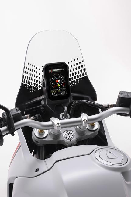 5-дюймовый дисплей приборной панели DesertX имеет вертикальную ориентацию и оснащён именно так, как ожидаешь от современного мотоцикла: несколько вариантов раскладки виртуальных приборов, Bluetooth и подсказки навигатора. Но выглядит, если честно, как будто кто-то встроил в мотоцикл смартфон.