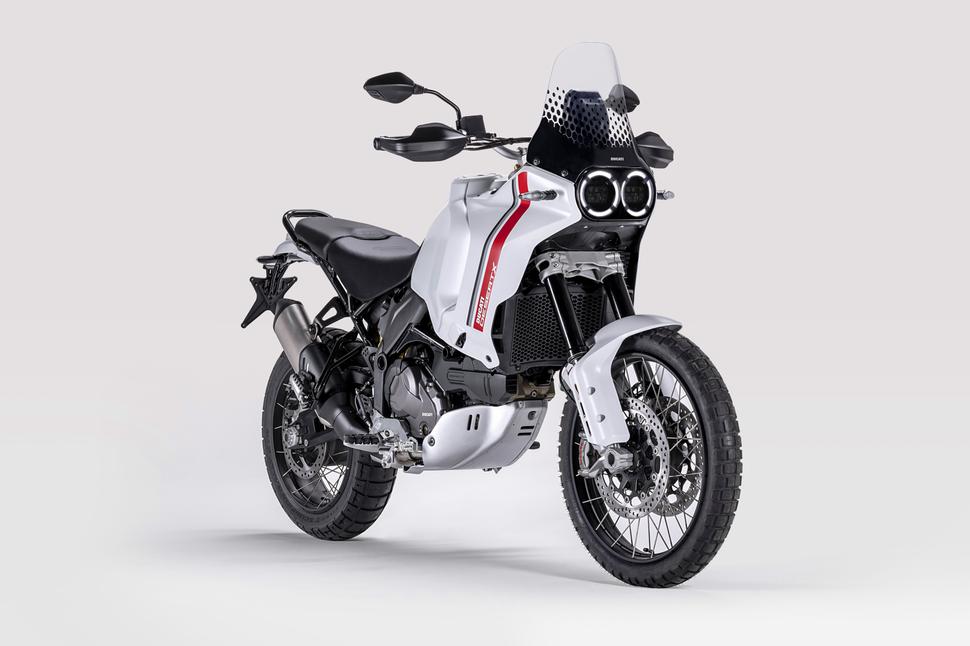 Первое впечатление о DesertX можно было получить в конце 2019 года, когда Ducati представили его концепт на базе платформы Scrambler с воздушным охлаждением. Серийная версия сохранила раллийный дизайн концепта, но перешла на водяную 937-кубовую Testastretta с десмодромным приводом клапанов. Визуально DesertX является явным наследником традиций эндуро-мотоциклов из 80-х, в частности, Cagiva Elefant подарил новинке узнаваемую белую расцветку, затемнённую нижнюю часть ветровика и двойные диодные фары с круглыми ДХО, но Ducati об этом вслух не упоминают ввиду того, что ещё один итальянский бренд с бОльшими правами на наследие Cagiva тоже анонсировал новинку в похожем стиле.