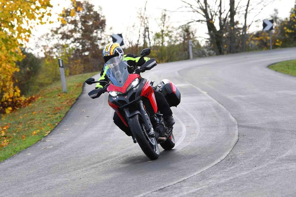 На извилистой горной дороге шасси V2 S проявляет себя с лучшей стороны: Ducati сделали новинку легче, в основном в части неподрессоренной массы благодаря использованию колёс от V4, что позволяет мотоциклу наклоняться довольно легко. Правда, хорошенько нагруженные кофры несколько нивелируют эффект от более лёгких колёс, но гироскопический эффект всё равно выражен слабее. И несмотря на весь этот багаж, Multistrada V2 S более чем охотно вышивает в череде поворотов среди пасторального ландшафта, рулится точно и отзывчиво, а подвески Skyhook EVO контролируют и клевок вилки на торможениях, и просадку зада на открытии газа, и отлично сглаживают неровности, делая езду мягкой и приятной. Работу подвесок замечаешь только задумавшись о них - новичок просто подумает, что так и надо, а опытный мотоциклист лишний раз порадуется о том, как всё качественно сделано.