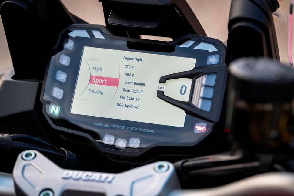 Как и раньше, доступны четыре режима: Городской, Туристический, Спортивный и Эндуро. С 19-дюймовым передним колесом в вездеходной резине новая Мультистрада вполне пригодна для выхода на грунтовку, причём в отличие от базовой V2, версия S оборудована системой полуактивных подвесок Skyhook EVO, на поведение которых выбор режима езды также влияет, как, впрочем, и на наклонный трекшн-контроль и ABS. Нагрузка на мотоцикл тоже меняет характер работы подвесок, поэтому выбираем в меню “райдер плюс багаж” для оптимальной работы, тем самым добавляя преднатяга задней пружины.