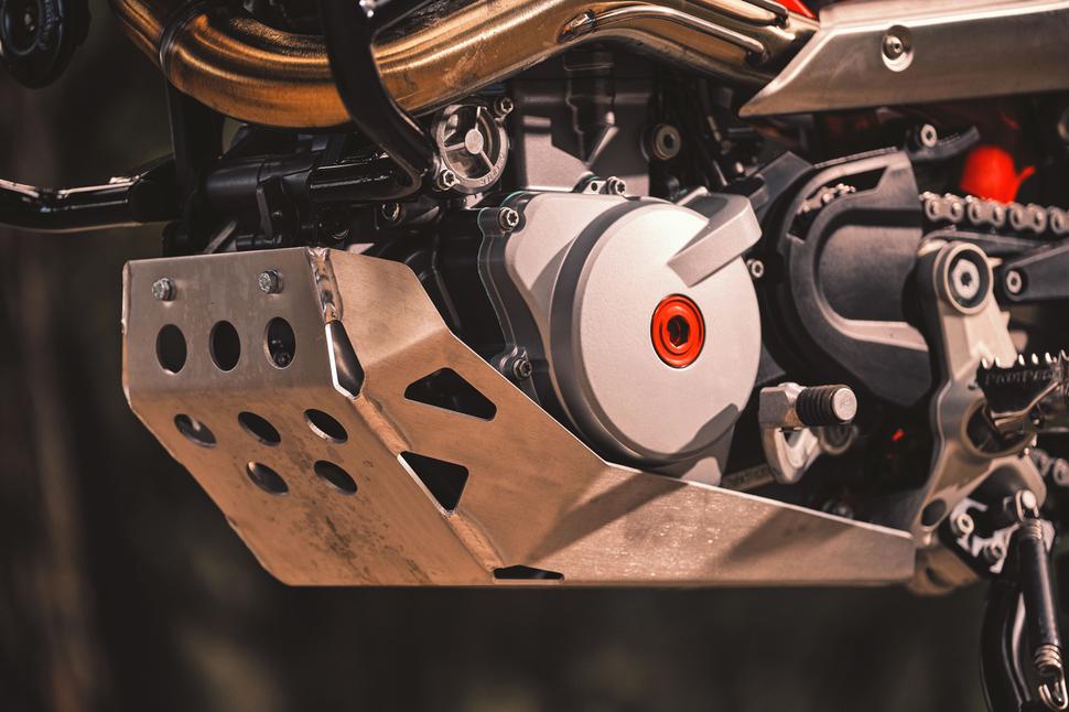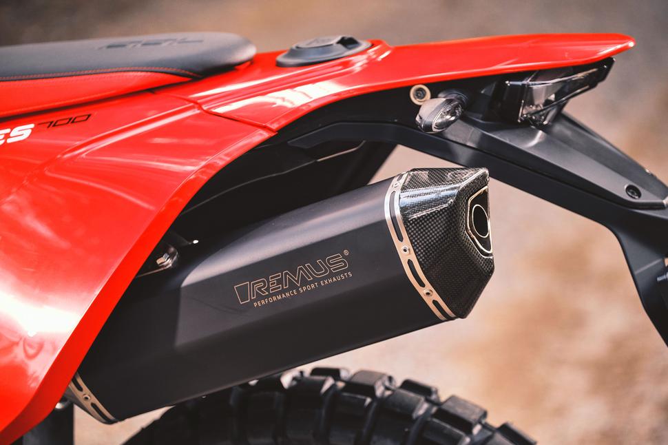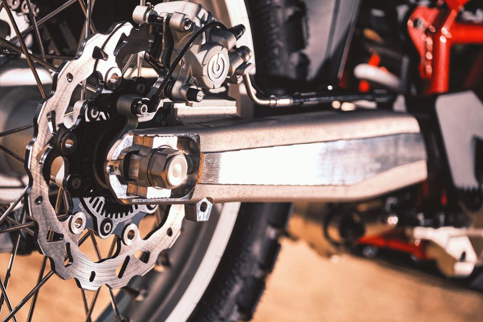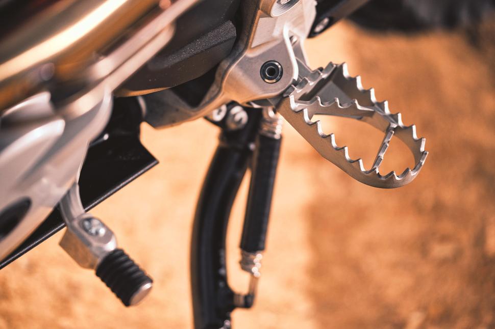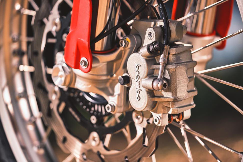 Большие спицованные колёса внедорожной размерности 90/90-21 спереди и 140/80-18 сзади, аирбокс с удобным доступом для замены воздушного фильтра, новейшая ABS от Bosch на тормозной системе Brembo с двухпоршневым плавающим суппортом на 300-миллиметровом плавающем диске спереди и однопоршневым суппортом на 240-миллиметровом плавающем диске с лепестковым краем сзади.