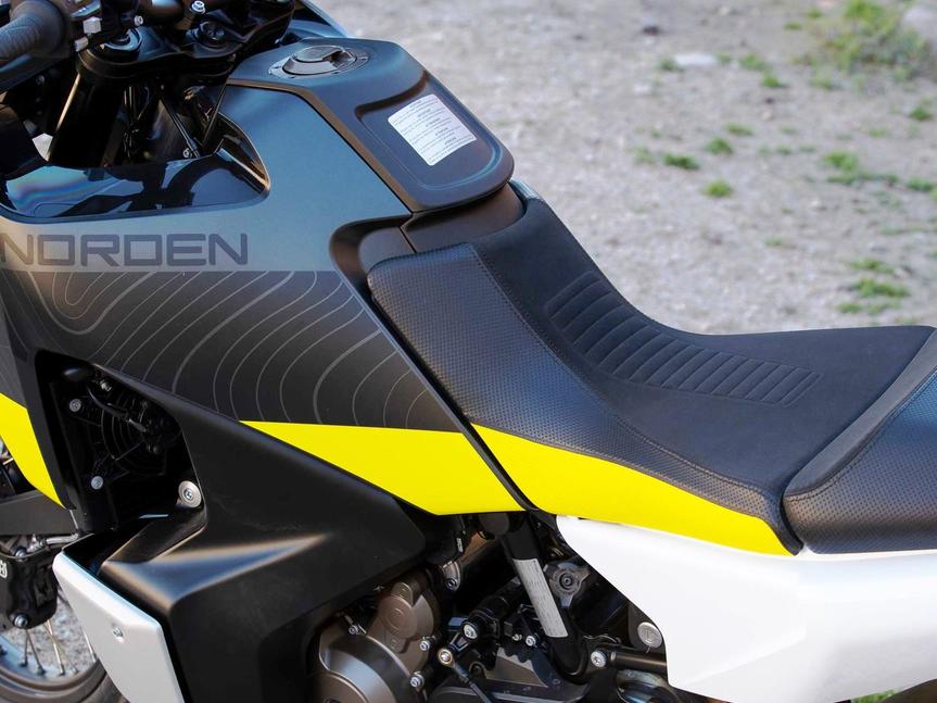 На ходу Norden оставляет очень приятные впечатления, по крайней мере поначалу, при выезде на дорогу, а с неё на шоссе. Было довольно прохладно, так что очень не хватало тёплых ручек и высокого ветровика. Интересно, что опциональные ветровики тоже не регулируются. Для роста 180см мотоцикл довольно высок, даже когда регулируемое седло стояло в нижнем положении. Регулируемые рычаги легко выставились в удобное положение.