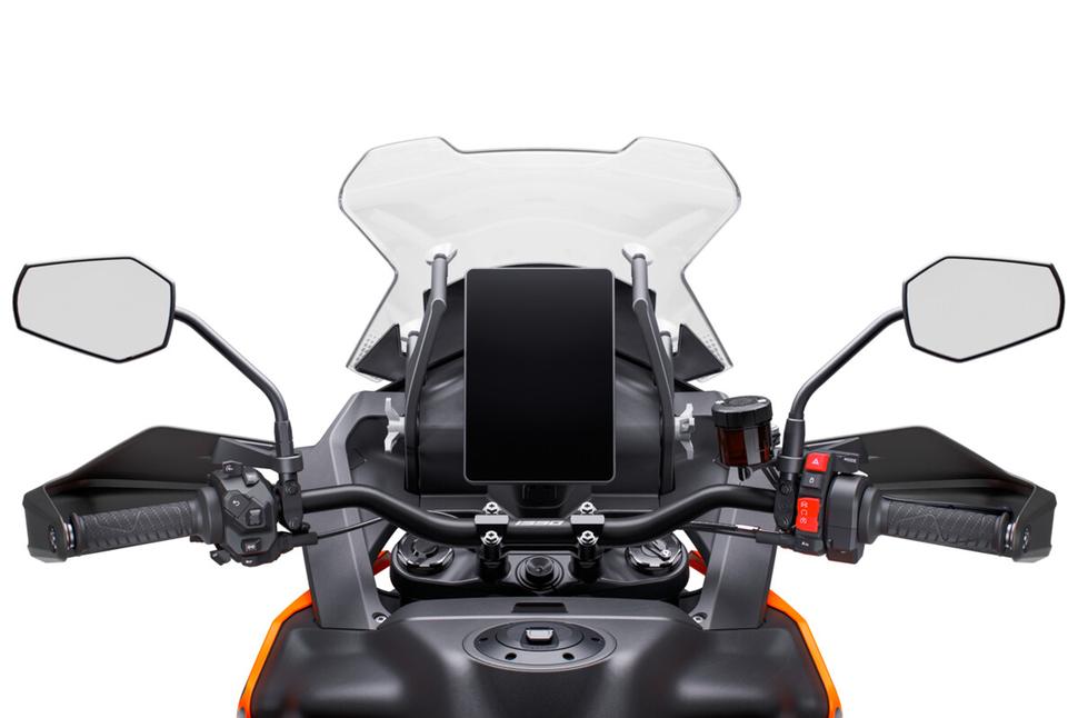 В качестве приборной панели KTM 1390 SUPER ADVENTURE S EVO конечно же оснащён новым премиальным сенсорным TFT-экраном V80 с портретной ориентацией. 8-дюймовый дисплей с индуктивным сенсором прекрасно реагирует на управление даже в толстых зимних перчатках, а инновационное антибликовое покрытие с защитой от отпечатков пальцев повышает читаемость.