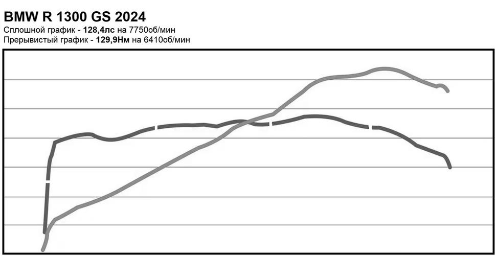 На весах BMW R 1300 GS 2024 года показал 256,7кг, а на диностенде выдал пиковые 128,4лс на 7750об/мин и 129,9Нм тяги на 6410об/мин. Для сравнения, BMW R 1250 GS 2021 года выдавал 117,4лс и 124Нм на том же диностенде. Обратите внимание на графики с диностенда: полка момента начинается практически с холостых, а мощность уверенно растёт до пика и не слишком проседает ближе к отсечке. Это один из лучших мотоциклетных двигателей, который способен и тащить как трактор где-нибудь в грязи, и как следует поливать на хорошем асфальте.