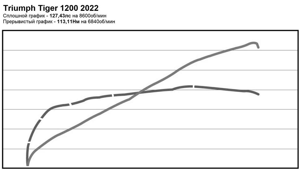 На диностенде Triumph Tiger 1200 GT Pro показал пик в 127,43лс на 8600об/мин и 113,11Нм на 6840об/мин. Кривая мощности двигателя нарастает весьма плавно и равномерно, лишь перед отсечкой в 8800об/мин достигая пика и достаточно резко уходя вниз. Что касается тяги, то уже с 3200об/мин доступно 90Нм, а в районе 4000об/мин возникает небольшой скачок крутящего момента, ощутимый на ходу. Затем тяга продолжает постепенно нарастать до пика, после которого так же медленно снижается вплоть до отсечки.
