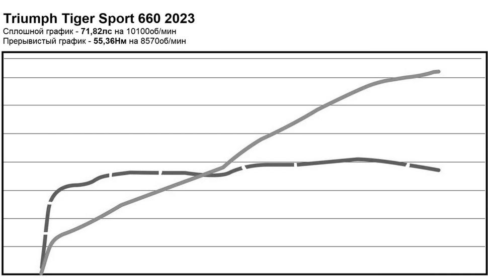 На диностенде Tiger Sport 660 2023 года показал пиковые 71,82лс на 10100об/мин и 55,36Нм на 8570об/мин. Весьма впечатляет его ровная полка момента, так как примерно 90% тяги доступно уже с 3500об/мин, что в сочетании с линейным ростом мощности вплоть до отсечки на 10250об/мин делает мотор чрезвычайно эластичным и удобным для повседневной езды.