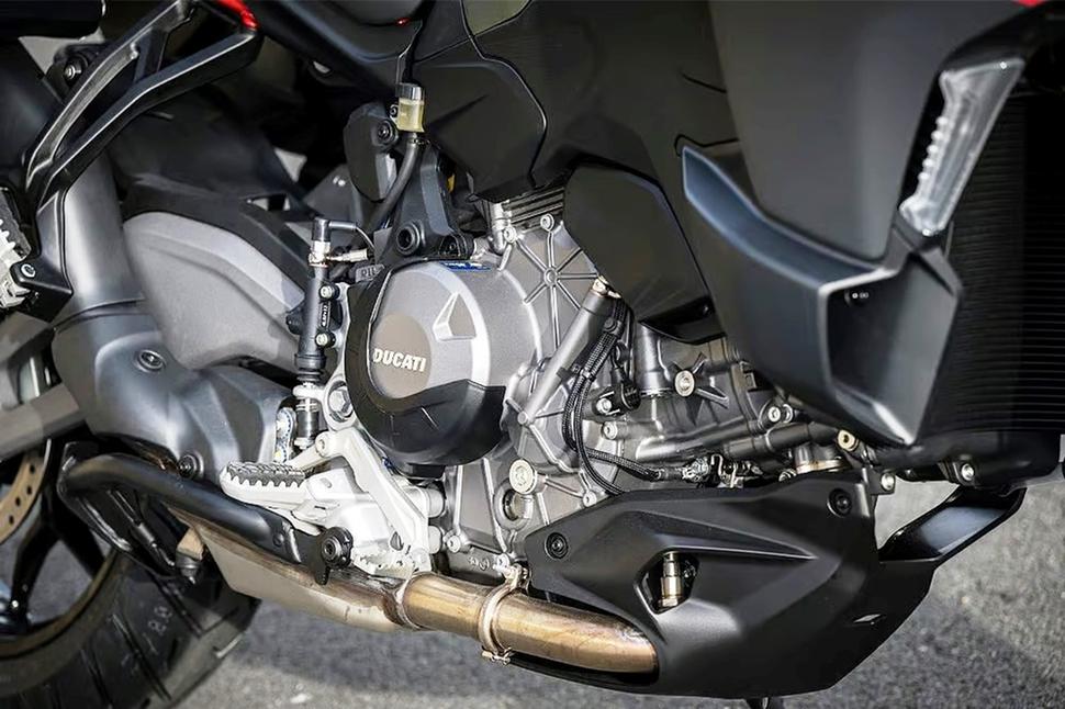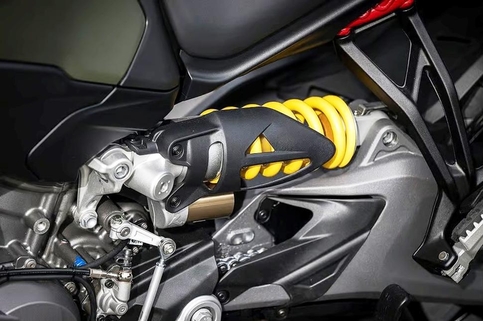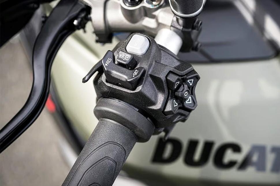 Как бы хороши ни были электронные подвески, они не идеальны. Как и у Multistrada V4 S, задняя подвеска V2 S автоматически распускает преднатяг на остановке, чтобы было удобнее доставать до земли. У обеих моделей система активируется и деактивируется длинным нажатием отдельной кнопки на правом пульте. Но на этом сходство заканчивается.