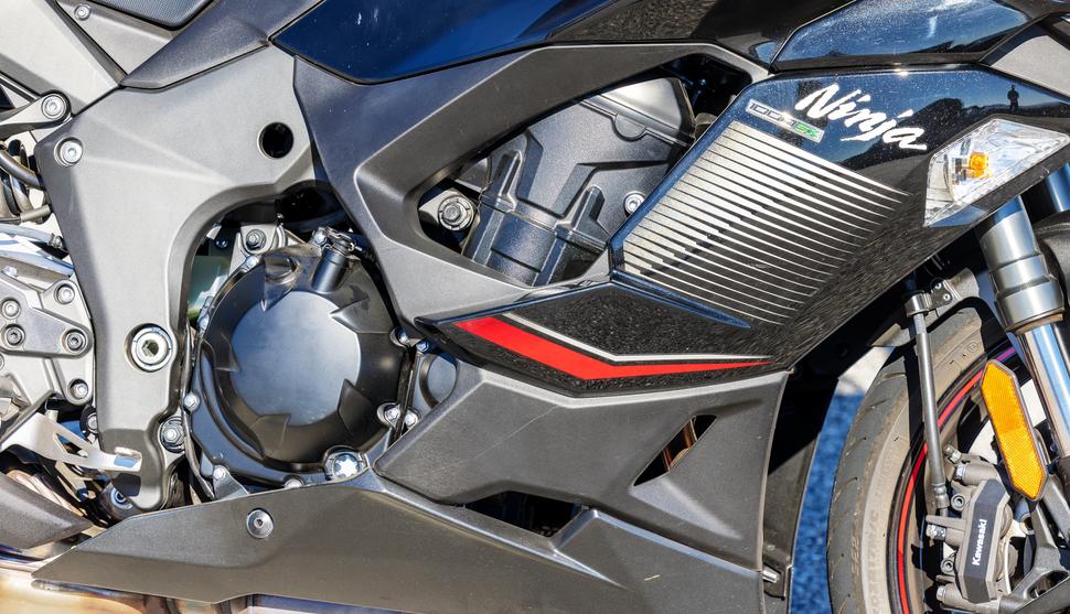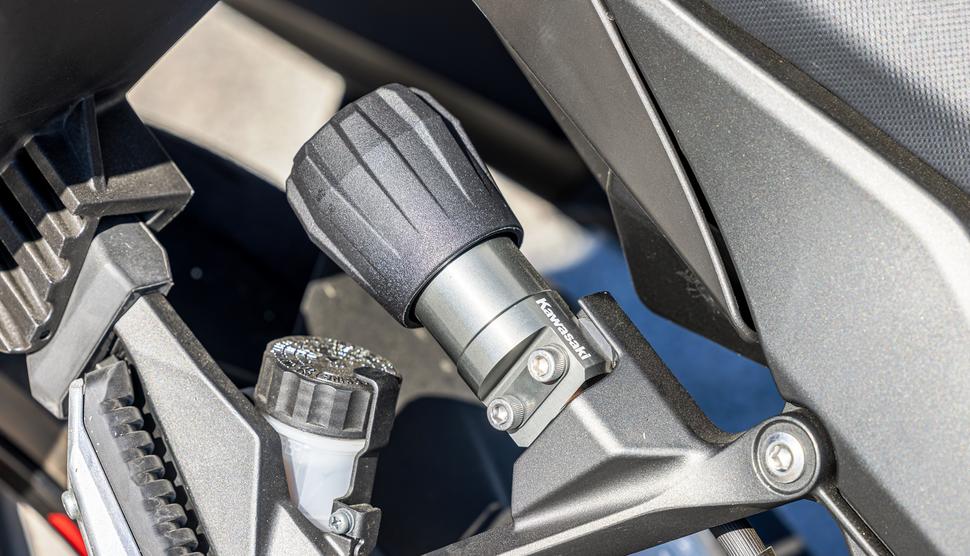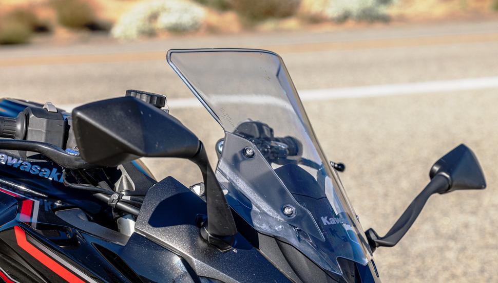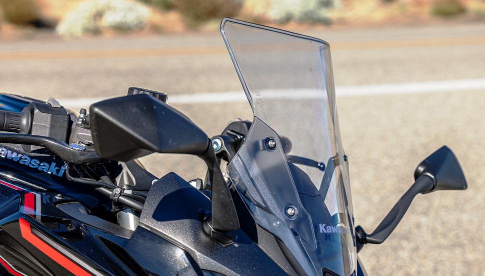 Впрочем, есть вопросы и к ветровику Kawasaki. Рычажок, который нужно отщёлкнуть для его регулировки, находится под приборами, спрятанный позади тормозного бачка, шлангов и тросов, проходящих через переднюю часть мотоцикла. До него весьма неудобно добираться, а регулировать высоту ветрового стекла приходится двумя руками (видимо, поэтому на мотоцикле имеется стикер, согласно которому делать это на ходу запрещено).