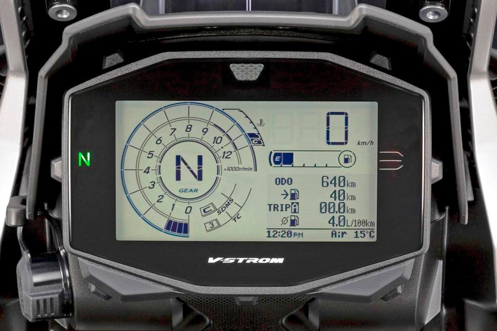 Посадка и эргономика модели вполне характерна для турэндуро, а новый конический алюминиевый руль установлен на виброгасящих проставках. Чуть дальше руля расположена новая многофункциональная ЖК-панель, выполняющая функции приборки и не только. Поскольку V-Strom предназначен для дальних поездок, над приборной панелью находится перекладина для крепления GPS, рядом с которой расположена розетка USB.