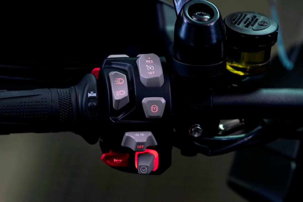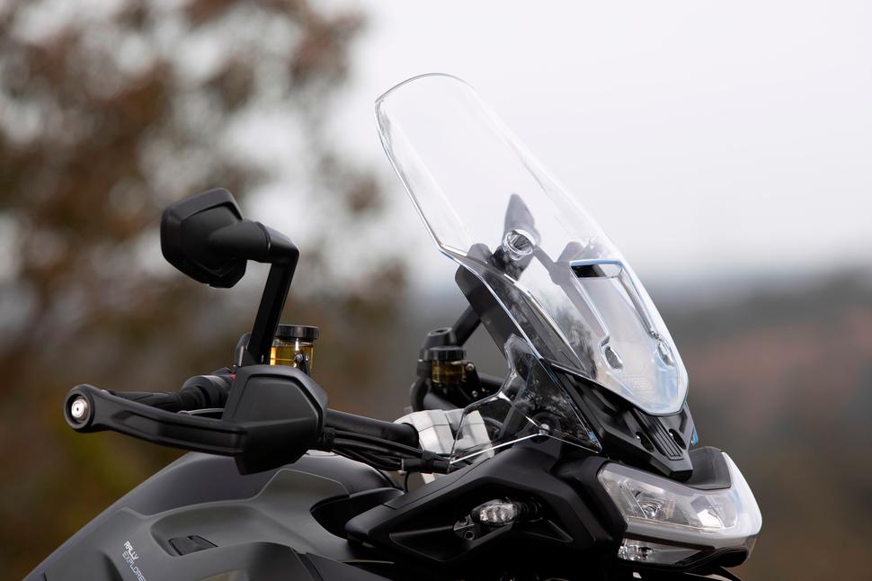 Естественно, ещё одна выдающаяся особенность - это мотор. 1160-кубовая тройка несколько утратила равномерный стрёкот, напоминающий швейную машинку, и обрела некоторую брутальность и грубость. Это привело к тому, что мотоцикл чуть больше вибрирует, но не настолько, чтобы это как-то мешало. Возможно, если дольше ехать в монотонном темпе, да ещё неправильно выбрать обороты - то и начнёт сушить руки, но на первый взгляд такого нет. Зато есть круиз-контроль, так что можно частично расслабиться, размять кисти и всё такое. В Спортивном режиме езды газ чуть-чуть резковат, и это напрягает, когда крадёшься в потоке или ползёшь по знакам в небольшом городке… Но стоит переключить Tiger в Дорожный режим езды, как он становится мягким и урчащим, не дёргается на открытии-закрытии газа.