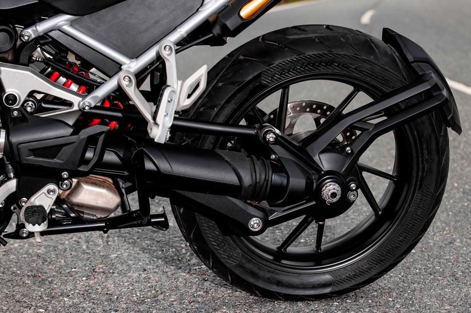 Triumph Tiger 1200 по-прежнему оснащён карданным приводом, только в новой версии он цельный, а не состоит из двух элементов, как раньше. Зато в новинке усложнился маятник - он теперь тройной, а не простой односторонний, как раньше. Выглядит сложно, но по сравнению с обычным двухсторонним маятником при замене колеса нужно открутить всего один дополнительный болт. Зато благодаря такой трёхрычажной конструкции Triumph сократили неподрессоренную массу почти на полтора килограмма, что весьма существенно. Обслуживание кардана сводится к замене трансмиссионного масла раз в два года независимо от пробега - вот всем бы так.